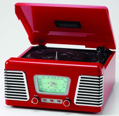 60's style look Turntable: 3 speed 33/45 & even 78's MW & FM radio illuminated dial scale Red finish with chrome look trim. Audio out socket. Earphone/headphone socket. Plays any size record with lid closed. Mains powered.