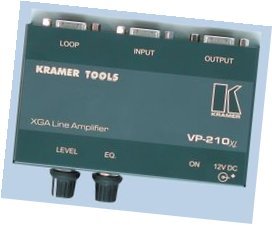 * VP-210x1 XGA Line Amplifier * The Kramer VP-210x1 is a high performance line amplifier for VGA/XGA signals. It accepts one input, provides correct buffering and isolation, loops it out to a local monitor or another acceptor and outputs an amplified and equalized signal to a remote acceptor. The machine provides output level control and cable equalization, using two rotary controls on the front panel of the machine. The machine allows input signal termination and ID bit control via bottom as accessible switches. Video bandwidth exceeding 380MHz ensures that the VP-210x1 remains transparent even at the highest resolution UXGA modes (1600x1200). It is ideal for remote monitor applications or presentation systems requiring a local monitor and a large screen display such as a projector, at close or remote locations. A 12V power supply is included