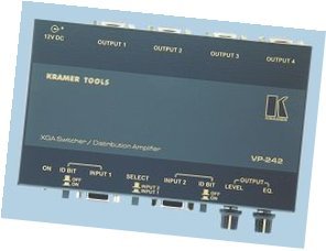 * VP-242 2x1 XGA Switcher / 1:4 Distribution Amplifier * The Kramer VP-242 is a high performance, high-resolution, 2x1 switcher and a 1:4 distribution amplifier for VGA through UXGA signals. The machine includes ID bit control for both inputs, as well as LEVEL and EQ. controls for the outputs. Video bandwidth exceeds 400 MHz ensuring transparent operation in all graphics and presentation applications * Dimensions (WxHxD): 190x25x135mm
