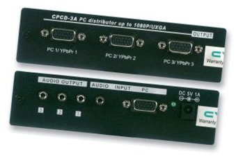 * HD AV Distribution Amplifier * A high performance unit for connecting a PC or HDTV source with audio to three PCinchs or HDTV displays (i.e. Plasma, LCD or Projector) via 15-pin Dsub connections. Perfect for presentations or home theatre applications. * Accepts one PC or HD component input and split it into 3 buffered and identical outputs * Supports stereo audio input and split it to 3 identical outputs via 3.5mm mini-stereo connector * Input: 15-pin Dsub and 3.5mm stereo audio jack * Outputs: 3x 15-pin Dsub and 3x 3.5mm stereo audio jacks * Supports VGA resolutions upto UXGA (1600x1200) * Supports HDTV resolutions upto 1080p * Supports either PC (RGB) or HDTV (YPbPr) input signal * Ideal for home theatre integration * Plug and play, easy to install and operate * Dimensions (WxHxD): 141 x 38 x 105mm * Supplied with power adaptor, user manual, HD15 video cable and stereo audio cable * HD SPLITTER, VGA, 1:3