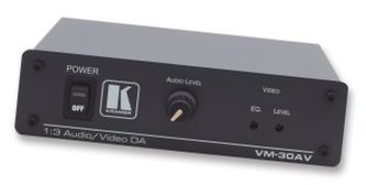 * 1:3 AV Distribution Amplifier * VM-30AV * A compact distribution amplifier for composite video and unbalanced stereo audio signals. It provides controls to compensate for signal losses inherent in long cable runs. * High Bandwidth * 430MHz at * 3dB * Video and audio on phono connectors * Audio Level Control * Level (Gain) and EQ (Peaking) Controls * Dimensions (WxHxD): 165 x 45 x 120mm. Weight 650g * Supplied with user manual, stacking brackets and power adaptor