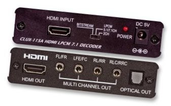 * HDMI Repeater with Audio Decoder Model: CLUX-11HS * A HDMI repeater that provides amplification and equalisation of a HDMI signal allowing longer cable runs. The unit also includes analogue audio decoder and has multi-channel outputs. Supplied with power supply. * Input: 1x HDMI socket * Outputs: 1x HDMI socket, 4x 3.5mm Jack sockets for analogue audio + TOSLink optical socket for digital audio * Provides HDMI signal amplification and equalisation up to 40dB * Compliant with HDMI 1.3, HDCP and DVI1.1 compliant * Supports high definition video, up to 1080p @ 50/60Hz * supports the transfer of deep colour (12bits/colour) video and low loss digital audio with a high bandwidth up to 225MHz. * Uncompressed LPCM 7.1, 5.1 or 2 Channel audio support through the HDMI connections * Digital Dolby 5.1 & LPCM 2 channel output via the TOSLink optical * Can be used with 20m cables to the input and 15m from the output